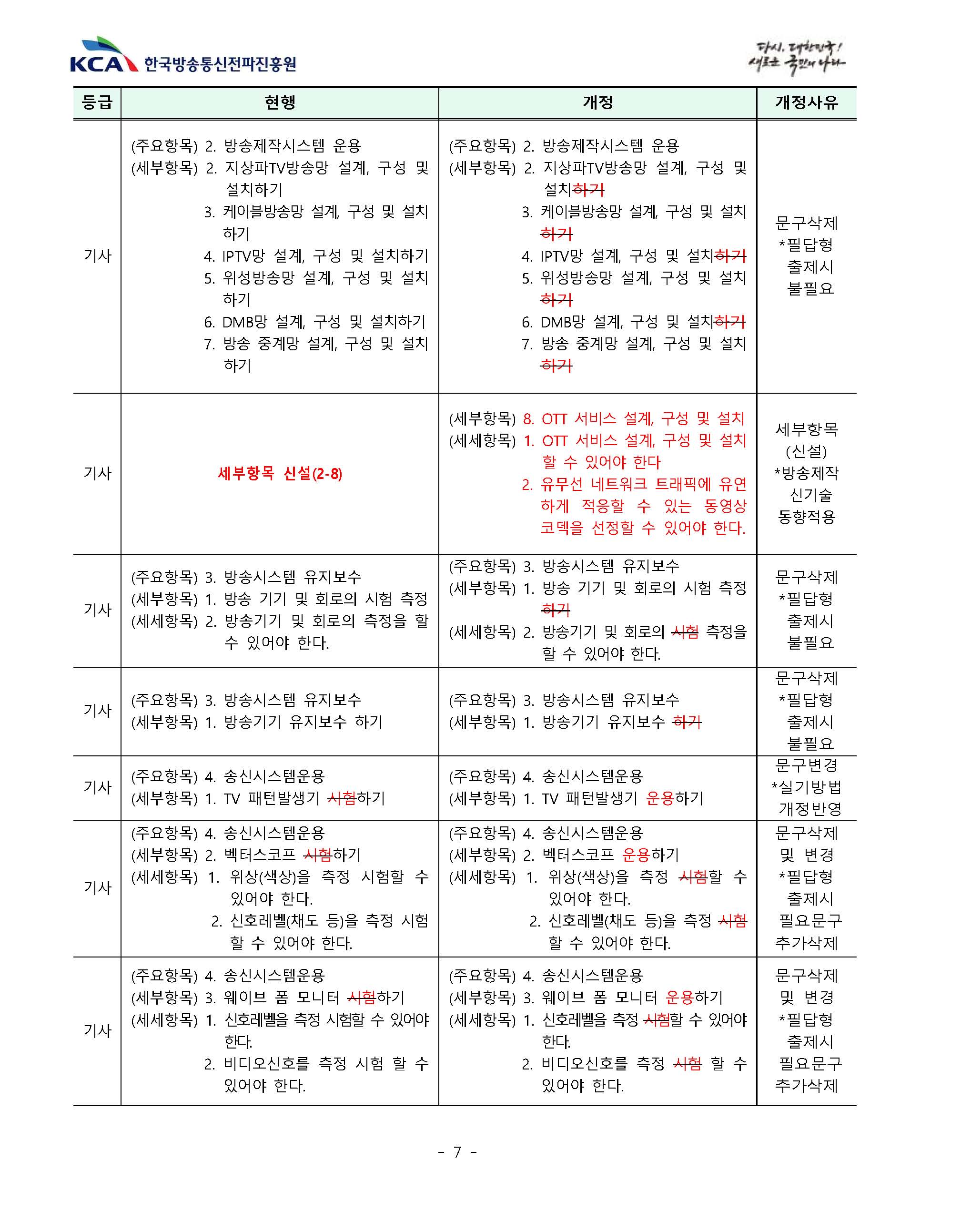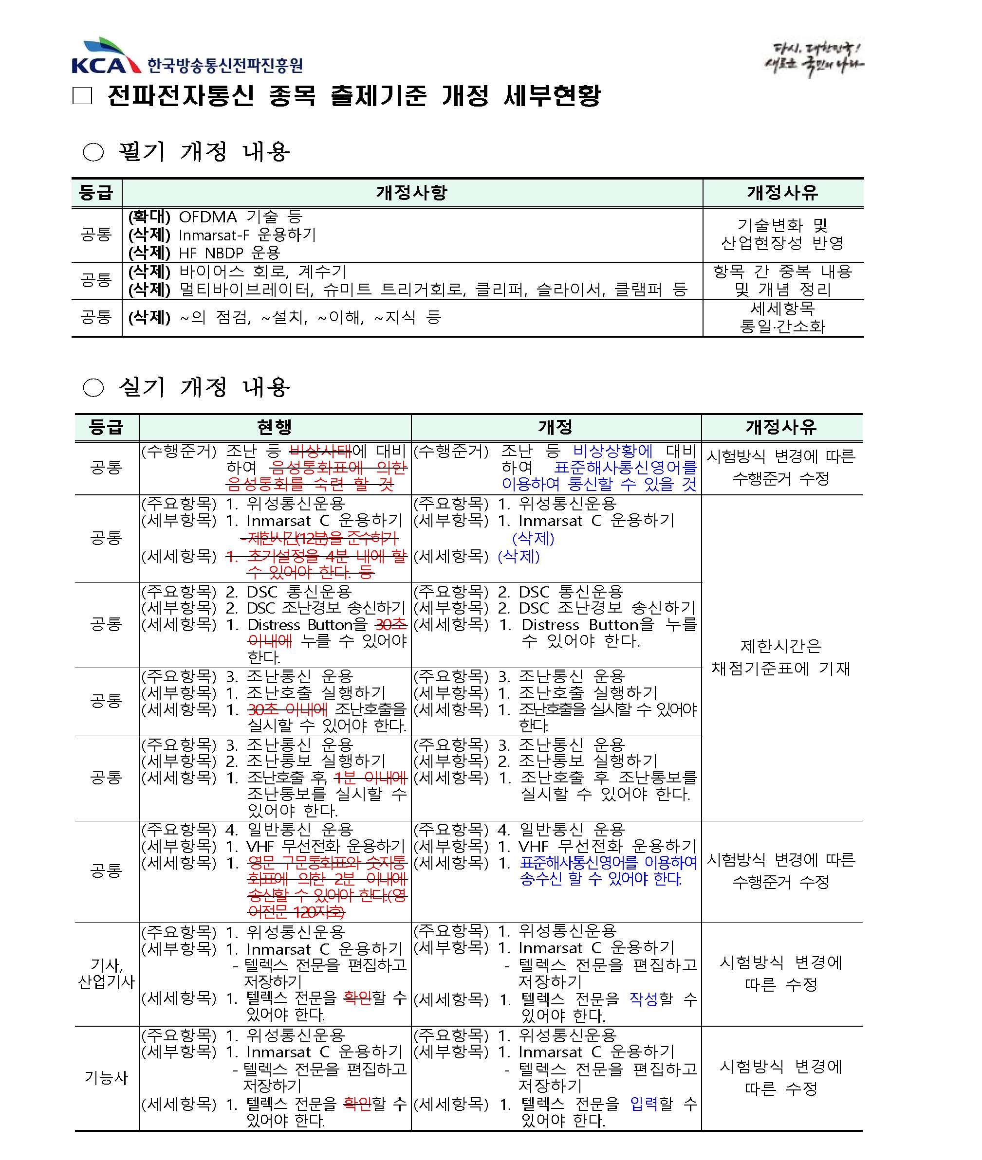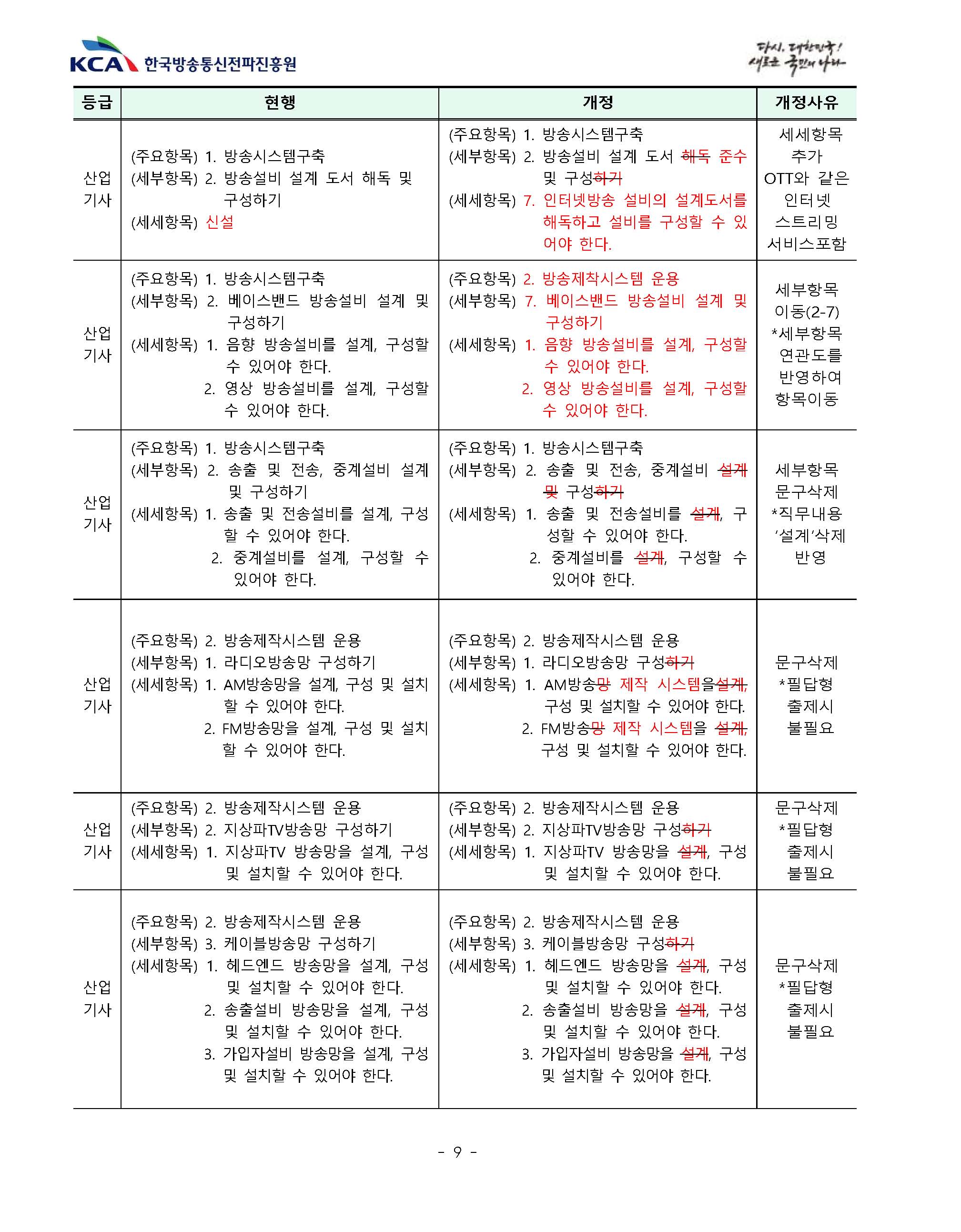 KCA에서 주관하는 방송무선, 정보통신, 선로기기 직무분야 주요 개정 내용입니다.