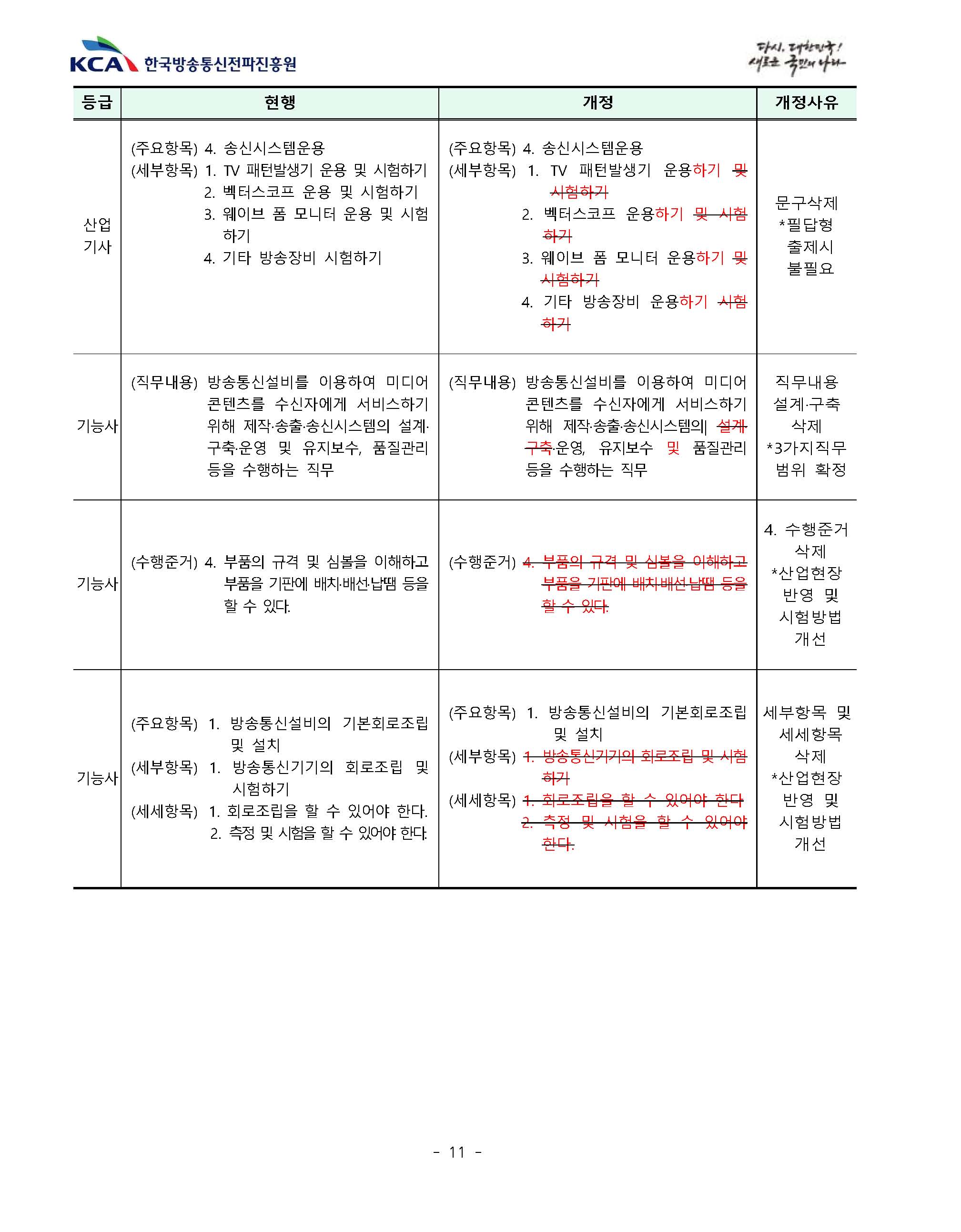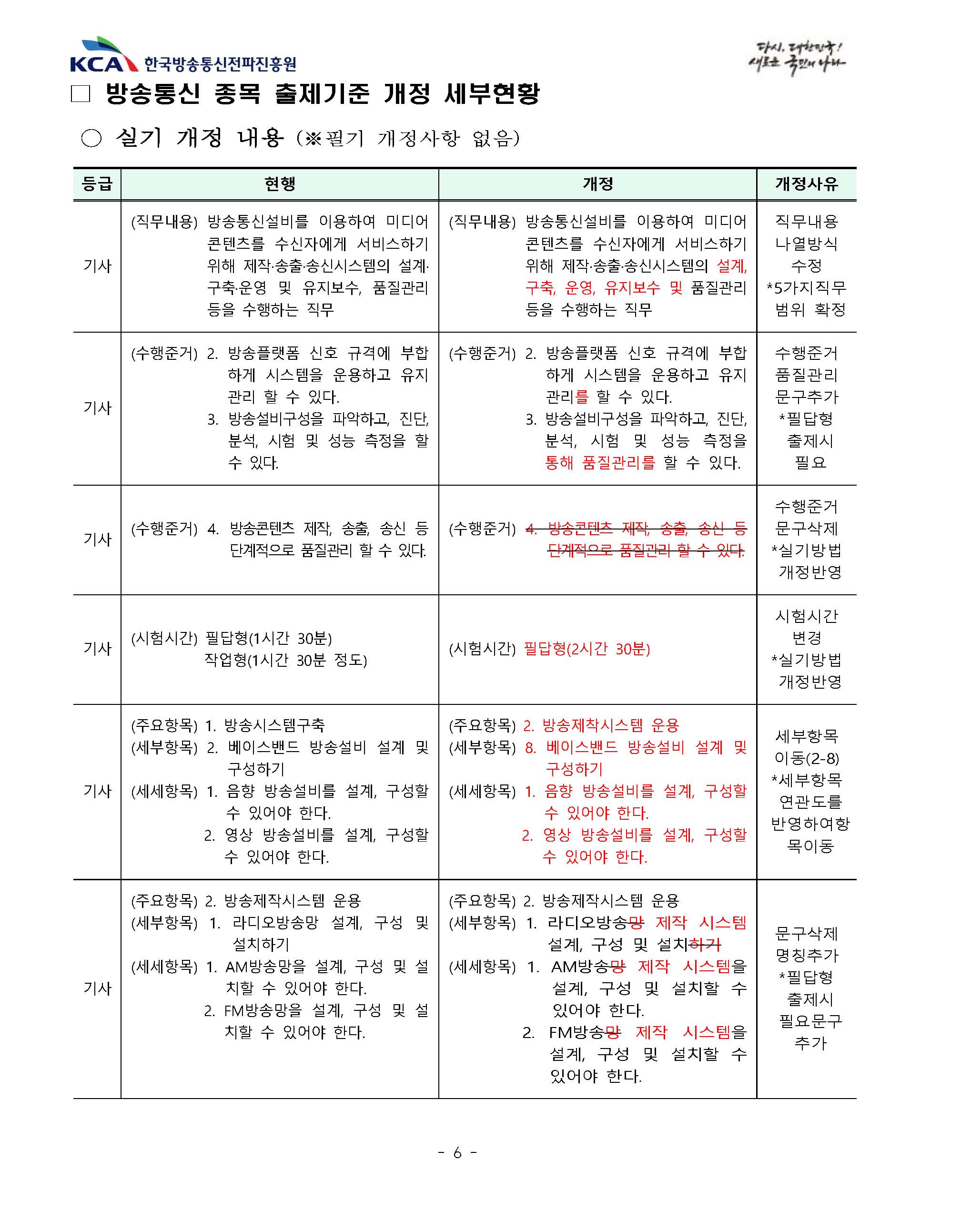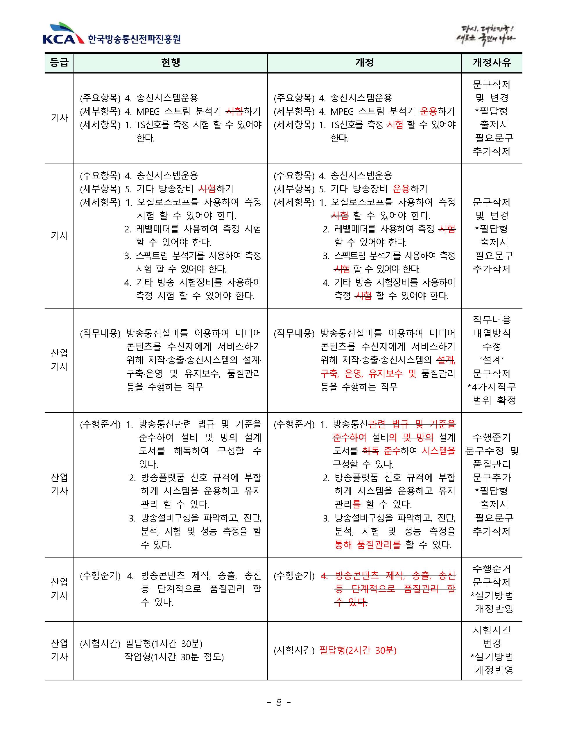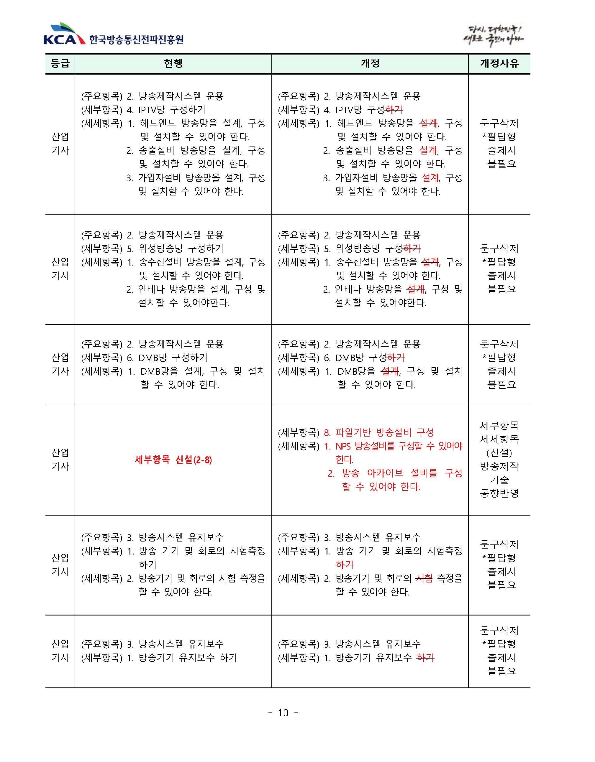 KCA에서 주관하는 방송무선, 정보통신, 선로기기 직무분야 주요 개정 내용입니다.