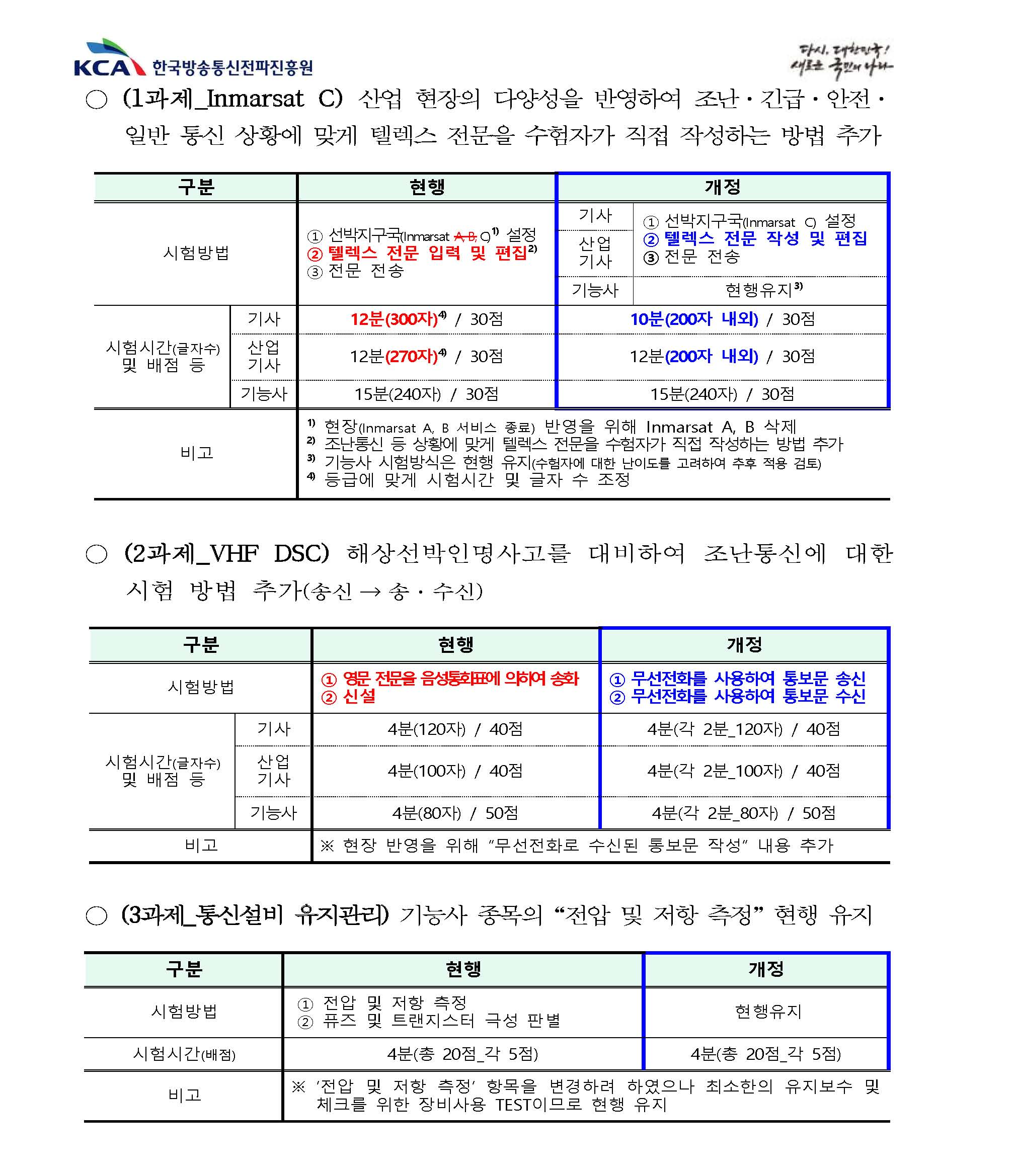 실기 1 과제_Inmarsat C은 산업 현장의 다양성을 반영하여 조난·긴급·안전·일반 통신 상황에 맞게 텔렉스 전문을 수험자가 직접 작성하는 방법을 추가했습니다. 실기 2 과제_VHF DSC은 해상선박 인명사고를 대비하여 조난통신에 대한 시험 방법을 송신에서 송·수신으로 변경했습니다.