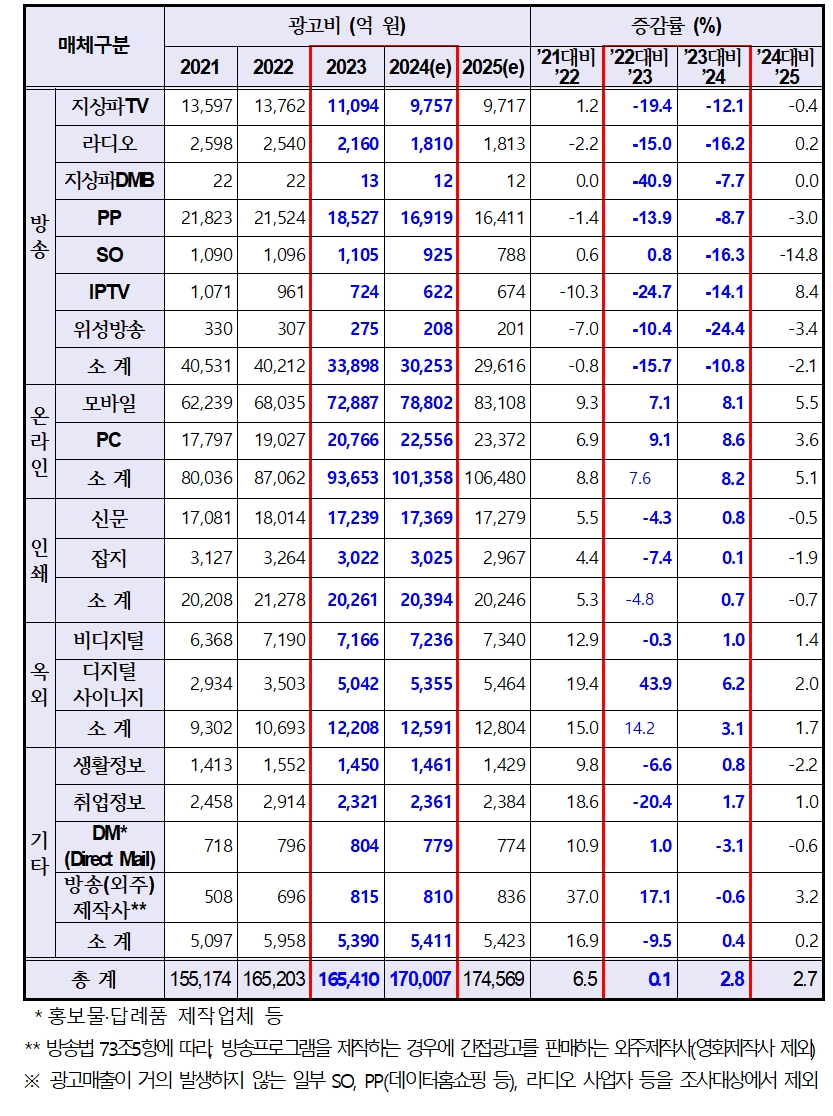 참고로 2024년 광고비는 조사 대상 사업체가 응답(7~10월)한 예상 광고비로, 실제 광고비는 달라질 수 있습니다.
