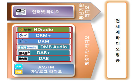 2012년 지상파 TV방송의 디지털 전환 이후 FM라디오 방송도 아날로그에서 디지털로 전환을 적극 추진할 예정이었으나 여러가지 사유로 지금까지 지지부진하다. 라디오의 디지털 전환을 위해 고려중인 방식은 다음과 같다. 미국식 디지털라디오 방식인 IBOC(In Band On Channel)의 HD Radio와 유럽식 방식인 DAB/DAB+ (Digital Audio Broadcasting Plus)/와 DRM+(Digital Radio Mondiale Plus) 등 세 가지 기술방식이다.